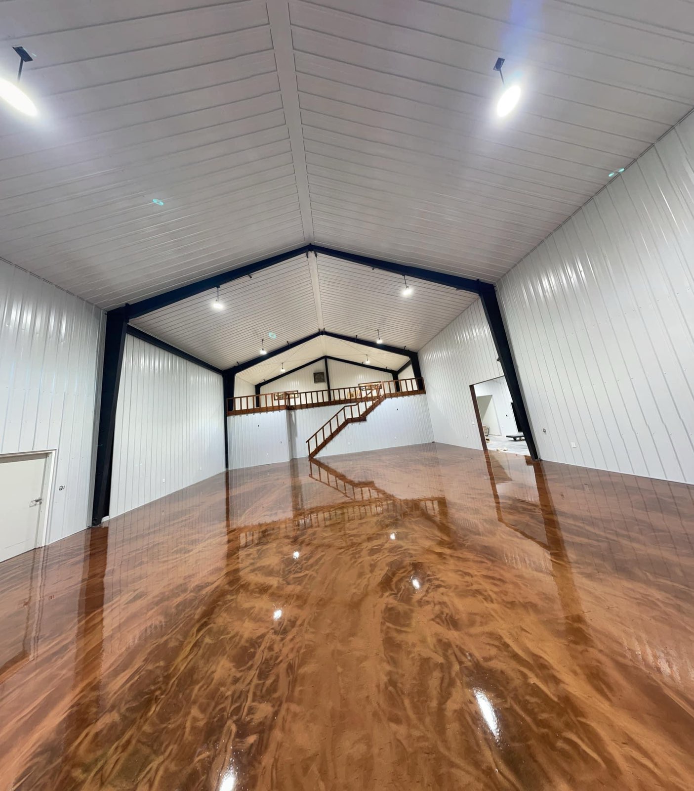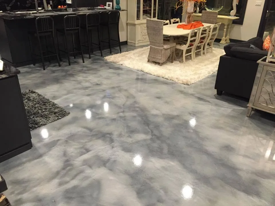 Metallic epoxy flooring is a decorative concrete coating created by mixing metallic pigments with epoxy resins. This process produces a unique, three-dimensional, marbled look that resembles natural stone, flowing water, or lava.